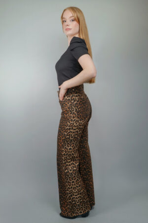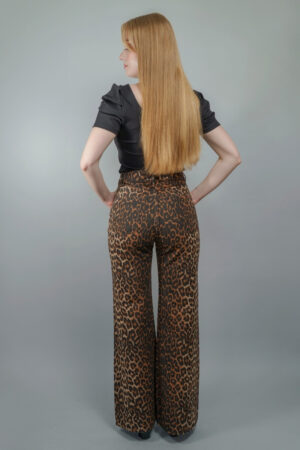 El pantalón Safari Elegance reinventa el animal print con un enfoque de alta costura. Confeccionado en denim stretch de algodón premium, ofrece un ajuste escultural que moldea la figura sin sacrificar comodidad. Su silueta acampanada con caída arquitectónica crea un efecto óptico de pierna infinita.